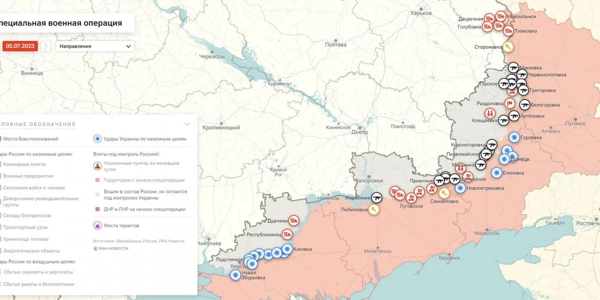 Карта боевых действий на Украине, 5 июля 2023г., от РИА Новости. Карта специальной военной операции.