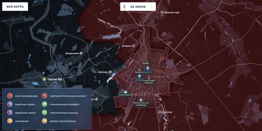 Карта боевых действий на Украине сегодня, обстановка 5 июля 2023 года от Mash. Бои на Артёмовском направлении