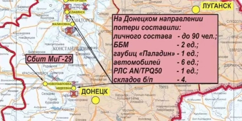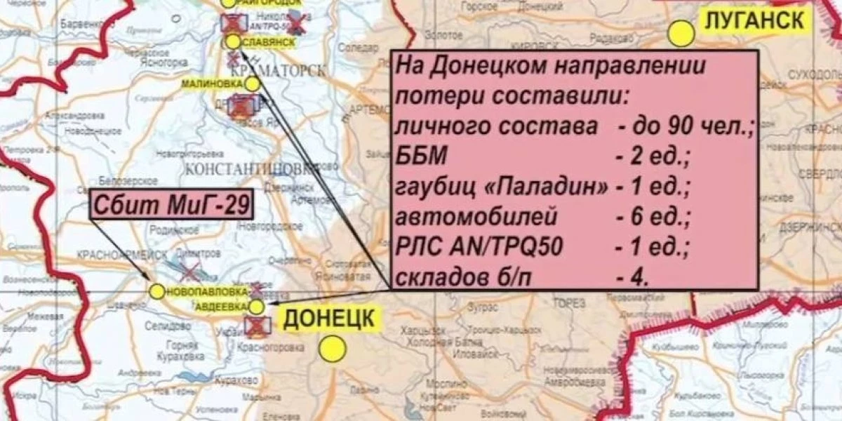 Оперативно-тактической и армейской авиацией, ракетными войсками и артиллерией поражены 89 артподразделений, живая сила и военная техника в 122 районах. В ДНР поражены пункт управления и склад ракетно-артиллерийского вооружения украинской армии.