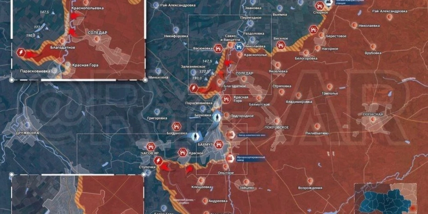 На юго-западе от Бахмута «вагнеровцы» при поддержке артиллерии и авиации продвинулись в районе водоканала и вышли к трассе от Константиновки. Закрепившись там и на севере Бахмута, российские подразделения фактически взяли под огневой контроль все логистические маршруты в город.