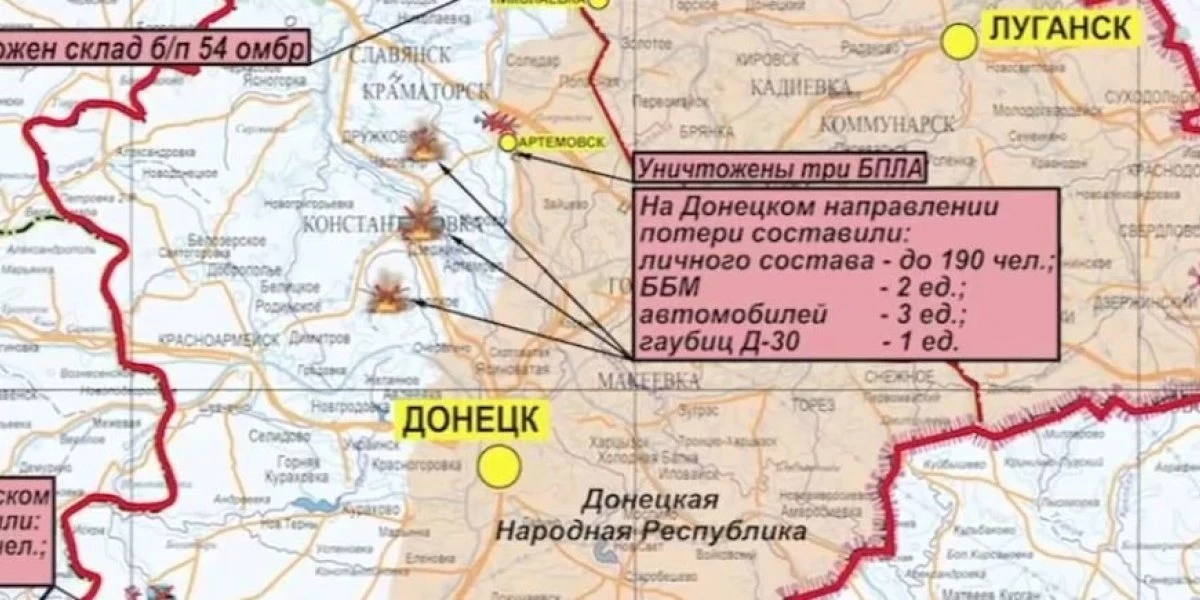 Авиацией «Южной» группировки войск нанесены ракетно-бомбовые удары по пункту временной дислокации 81-й аэромобильной бригады ВСУ на Лисичанском направлении, по скоплению вооружений и военной техники 24-й мехбригады ВСУ в районе Торецка, а также поражены скопления живой силы, резервы и склад боеприпасов 110 отдельной мехбригады ВСУ в Авдеевке.