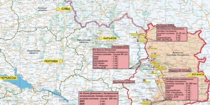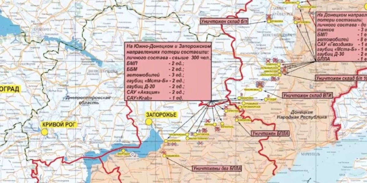 Общие потери противника за сутки на данных направлениях составили свыше 300 украинских военнослужащих, две боевые машины пехоты, две боевые бронированные машины, три автомобиля, две гаубицы «Мста-Б», две гаубицы Д-20, две самоходных артиллерийских установки «Акация», а также самоходная артиллерийская установка «Krab» польского производства.