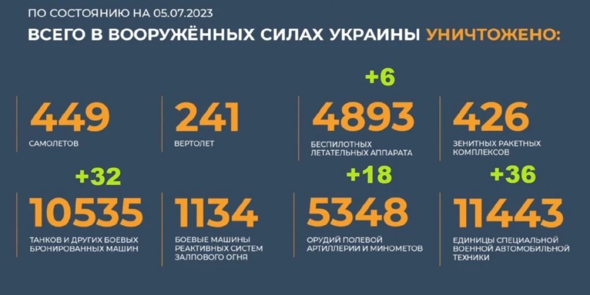 Потери Украины на сегодня 5.07.2023 Всего с начала проведения специальной военной операции уничтожено: 449 самолетов, 241 вертолет, 4893 беспилотных летательных аппарата, 426 зенитных ракетных комплексов, 10535 танков и других боевых бронированных машин, 1134 боевые машины реактивных систем залпового огня, 5348 орудий полевой артиллерии и минометов, а также 11443 единицы специальной военной автомобильной техники.