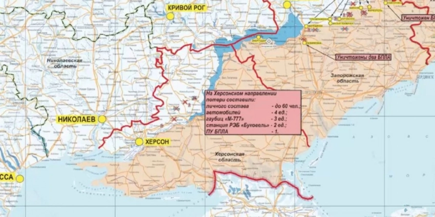 На Херсонском направлении в результате огневого поражения за сутки уничтожено до 60-ти украинских военнослужащих, четыре автомобиля, три артиллерийские системы М777 производства США, две станции радиоэлектронной борьбы «Буковель», а также пункт управления беспилотными летательными аппаратами.