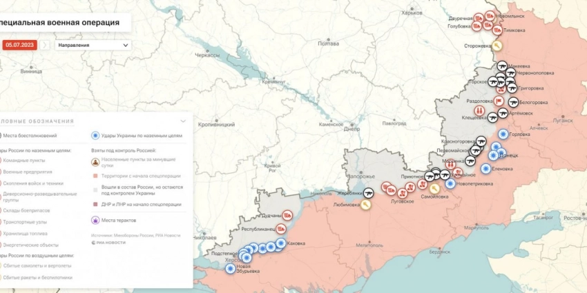 Карта боевых действий на Украине, к утру 6 июля 2023г., от РИА Новости