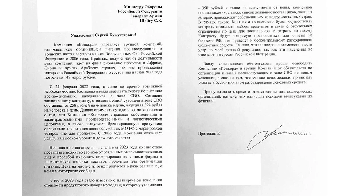 «Ввиду сложившихся обстоятельств прошу освободить Компанию «Конкорд» и группу Компаний от обязательств по организации питания военнослужащих в зоне СВО по новым условиям, в связи с тем, что считаю невозможным принимать участие в бесконтрольном разбазаривании денежных средств», – написал основатель ЧВК «Вагнер».