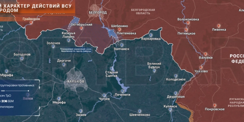 Среди украинских формирований распространяют сообщения о необходимости создания буферной зоны в 15-20 км вдоль российского приграничья. Вполне возможен сценарий заброски диверсионно-разведывательных групп ВСУ вглубь Белгородщины и «имитация» сценария взятия города «в клещи».