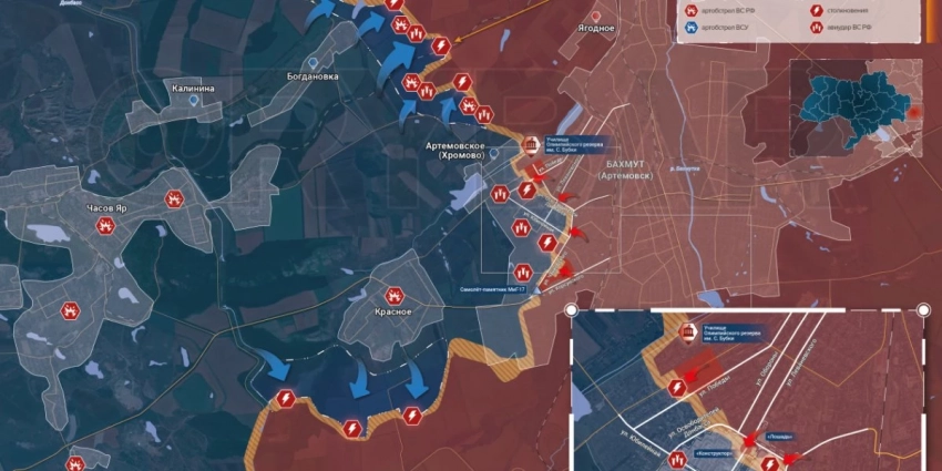 Артемовское (Бахмутское) направление: «оркестранты» продолжают штурмовать западные окраины Артемовска. На северо-западе города они продвинулись вдоль улиц Толбухина, Медведева и Черняховского. Также под контролем «оркестра» позиции в районе перекрестка улицы Защитников и Леваневского. Южнее российские войска вышли к 1-й лесной улице. В тоже время ВСУ активизировались слухи о начавшемся широкомасштабном наступлении Украины не подтвердились. ВСУ незначительно продвинулись на Артемовском направлении