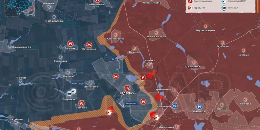 Несмотря на наши ранние сообщения о выходе к Авдеевке с юга, команда Рыбаря уточнила линию фронта: российские войска блокируют укрепрайон с юго-запада, юга, востока и северо-востока. База ВСУ к югу от Авдеевки находится под контролем противника, наши предположения о её занятии ВС РФ не подтвердились.