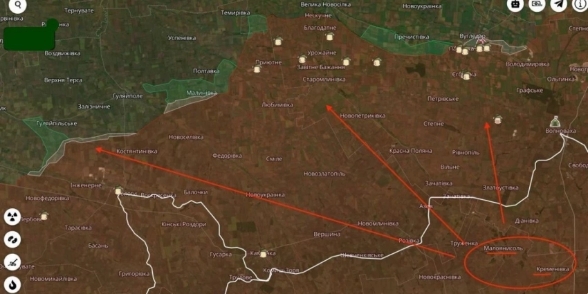 На запорожском направлении российские войска на земле неожиданно атаковали в районе Каменского. Это важный для ВСУ населённый пункт, расположенный на восточном берегу Днепровского водохранилища на трассе М-18, которая идёт от Запорожья на Мелитополь. Российская артиллерия нанесла удары по Степному, Новоандреевке, Орехову, Новоданиловке, Малой Токмачке, Гуляйполю и Ольговскому.