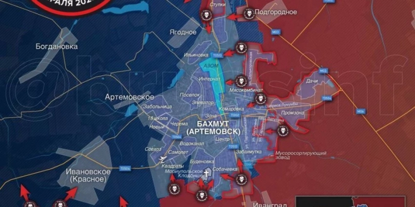 ?На юго-западе от Бахмута подразделениями 113 бригады теробороны ВСУ возобновился штурм позиций ЧВК «Вагнер» в трёх километрах юго-западнее Красного.