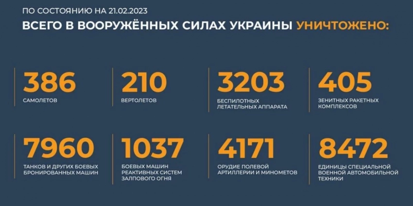 - Потери Украины на 22 февраля 2023 в ходе спецоперации Z, последние новости. Ликвидированы нацисты. Потери ВСУ на донецком направлении составили свыше 170 человек за минувшие сутки