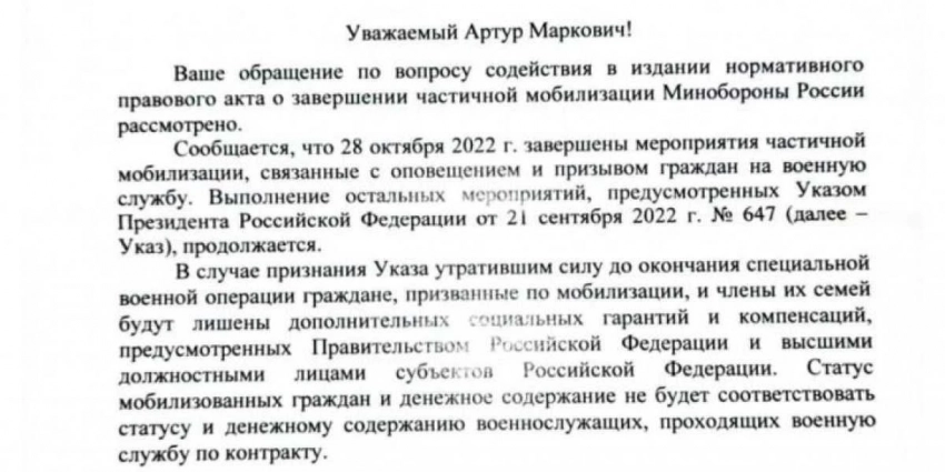 В декабре 2022 года я направил обращение в Министерство обороны РФ с просьбой содействовать изданию указа о завершении частичной мобилизации. Ответ, датированный 7 января 2023, я получил только сейчас. Врио начальника 2 управления Главного организационно-мобилизационного управления Генштаба ВС РФ С. Дроздов сообщает: