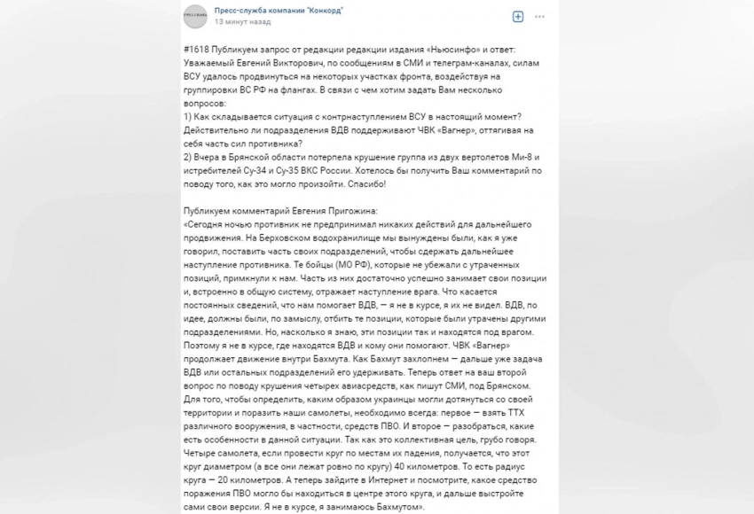 Журналисты также попросили предпринимателя дать оценку вчерашнему крушению двух вертолетов Ми-8 и истребителей Су-34 и Су-35 ВКС России в Брянской области. Чтобы понять, как Украина могла дотянуться со своей территории и поразить российские самолеты, нужно учесть особенности работы ПВО и разобраться в ситуации, ответил Пригожин.