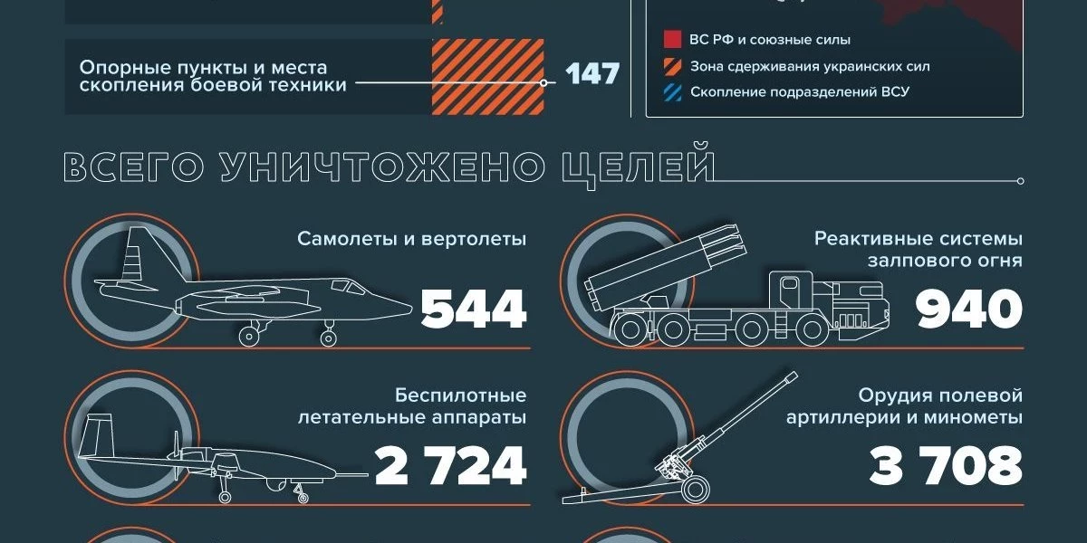 Минобороны РФ сообщает о поражении в минувшие сутки 58 артиллерийских подразделений Вооруженных сил Украины (ВСУ) и 86 районов скопления живой силы и техники. Также ликвидированы четыре реактивные установки «Град» и «Ураган», три гаубицы М777, польское самоходное орудие Krab.