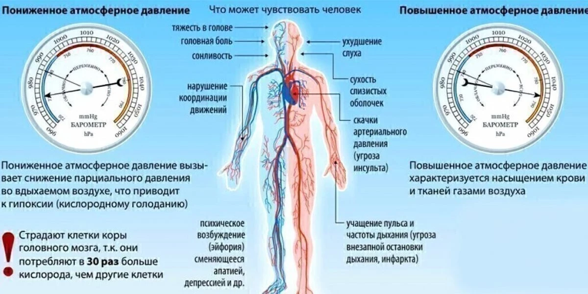 Изменения в атмосферном давлении могут оказывать влияние на здоровье человека. При понижении атмосферного давления наблюдается расширение сосудов, что может привести к головной боли, усталости и снижению работоспособности. При повышении атмосферного давления наблюдается сужение сосудов, что может вызвать болезненные ощущения в суставах и мышцах.