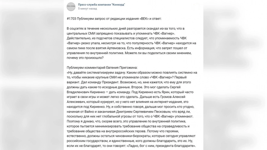 Основатель ЧВК «Вагнер» Евгений Пригожин назвал возможных авторов запрета на упоминание «оркестра» в СМИ. По его словам, «музыкантов» хотят вычеркнуть из-за зависти их популярности.