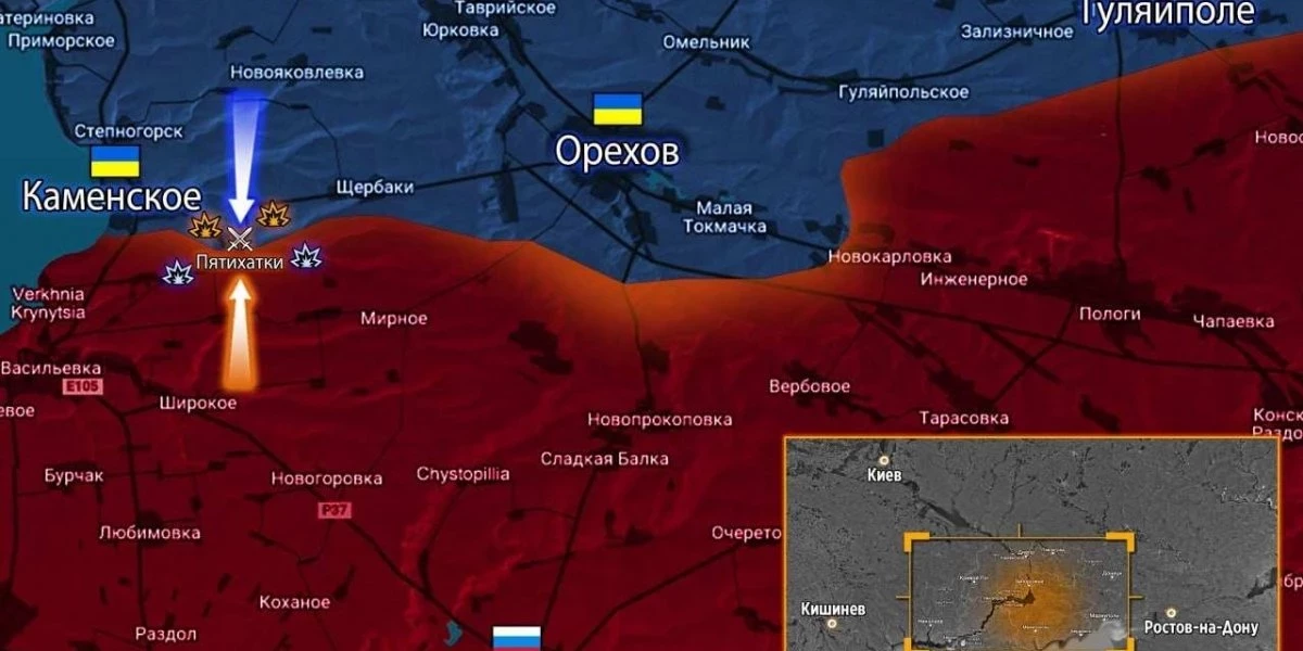 Ореховский участок. Уже больше суток продолжаются интенсивные бои в Пятихатках к юго-востоку от Каменского. Ротные группы 128 огшбр ВСУ несколько раз пытались закрепиться в селе, потеряв несколько десятков человек. Ранним утром украинские десантники возобновили штурм при поддержке артиллерии. Поставив дымовую завесу, подразделения ВСУ со стороны Лобкового снова пошли штурмом на Пятихатки.