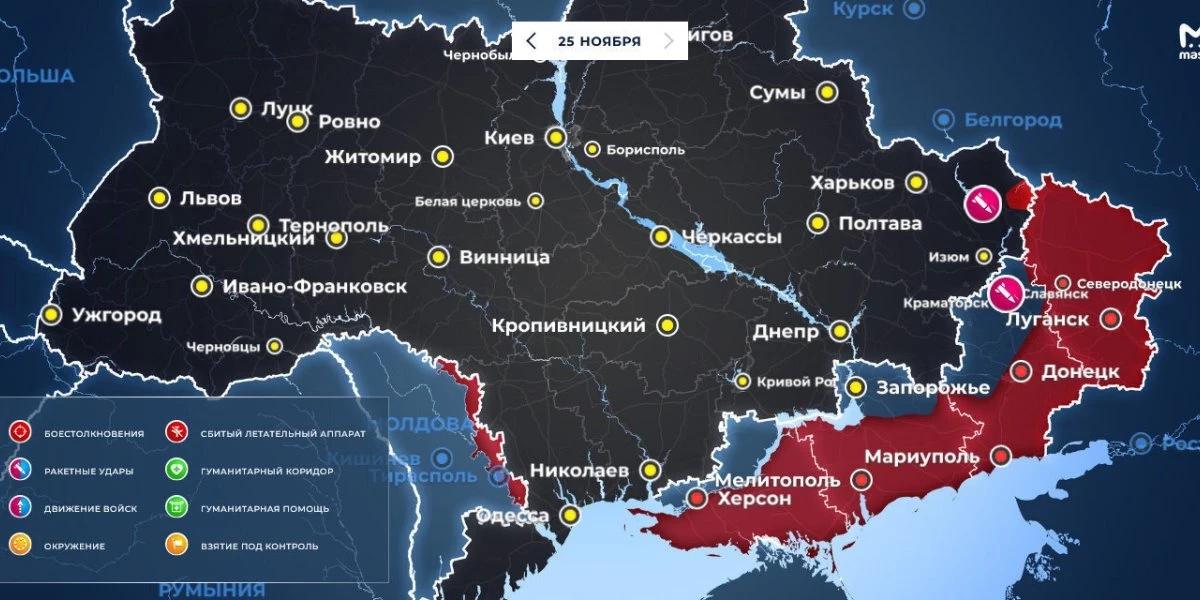 Обстановка на Донбассе и Украине на сегодняшний день, 26 ноября, карта боевых действий и продвижения войск РФ, последний брифинг Минобороны, свежие видео-сводки от Юрия Подоляки, Игоря Конашенкова и Михаила Онуфриенко — собрали актуальные новости по Украине.
