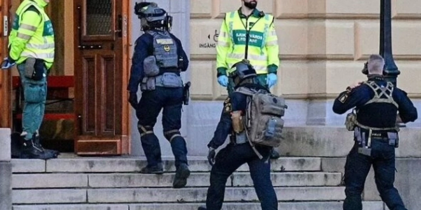 Полицейский спецназ входят в здание школы на месте стрельбы в Мальме, Швеция, 21 марта. несколько человек ранены.