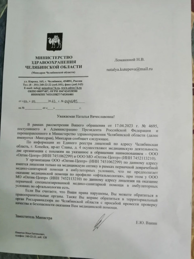 Оказывается, в Копейске на проспекте Славы работают сразу два «Оптик-центра» с разными лицензиями