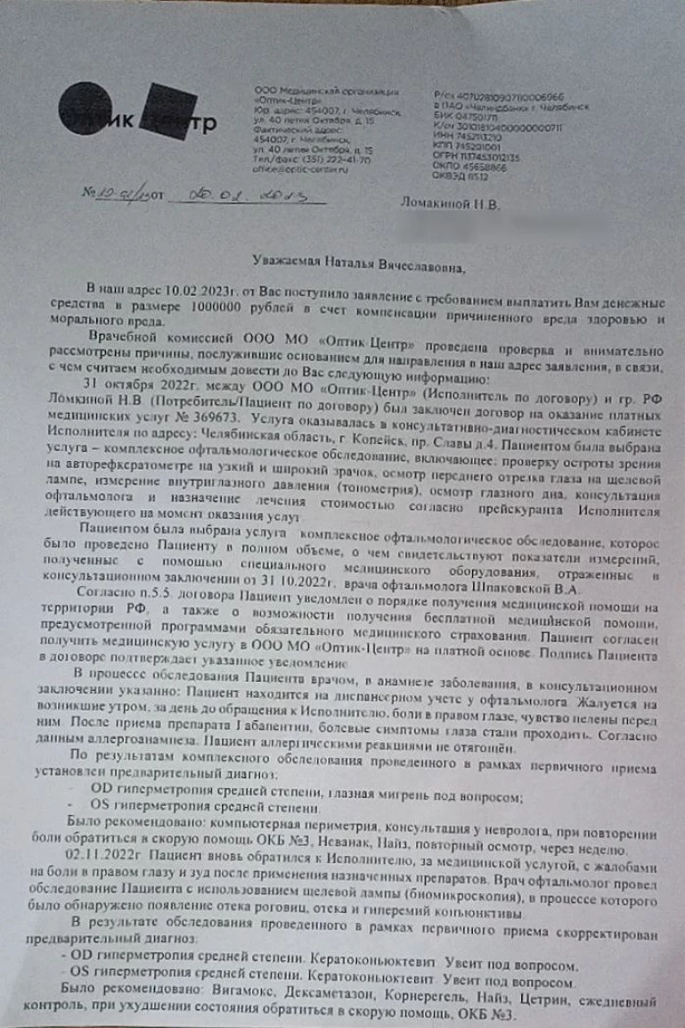 До обращения в пресловутую клинику Наталья Ломакина даже не состояла на учёте у офтальмолога. Теперь она рассчитывает возместить и материальный, и моральный ущерб. В клинике на сотрудничество не пошли.