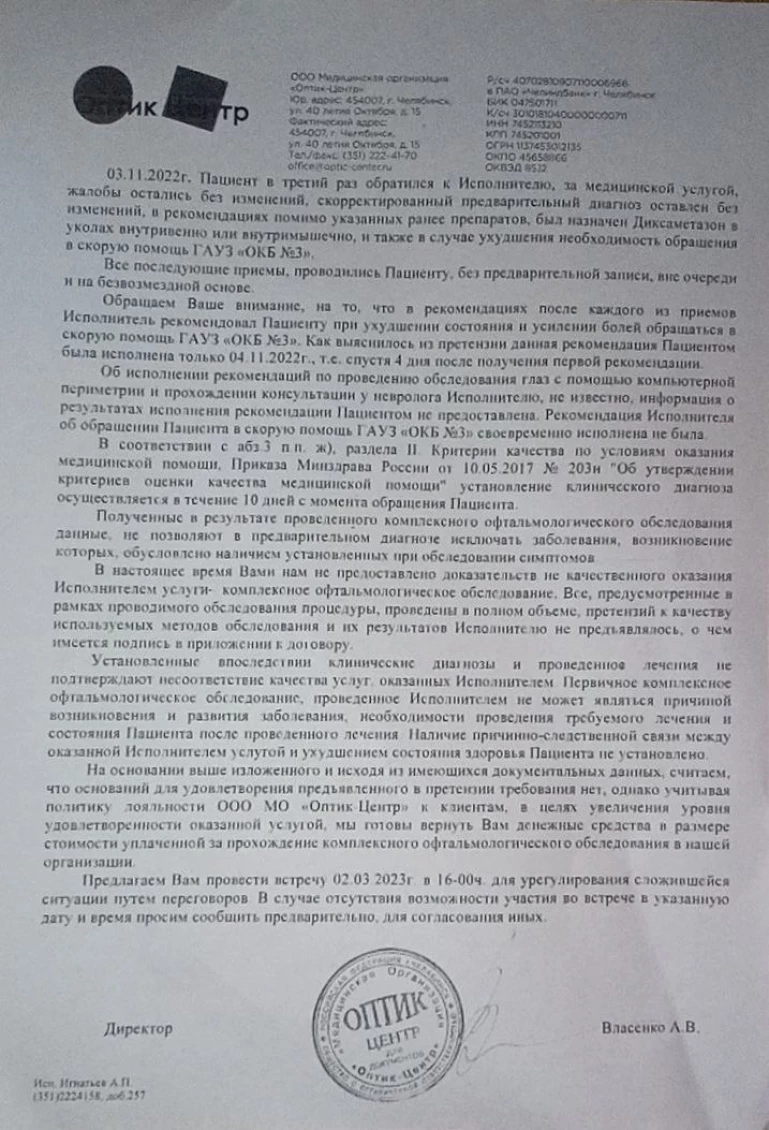 В «Оптик-центре» взять ответственность за печальные последствия отказываются.