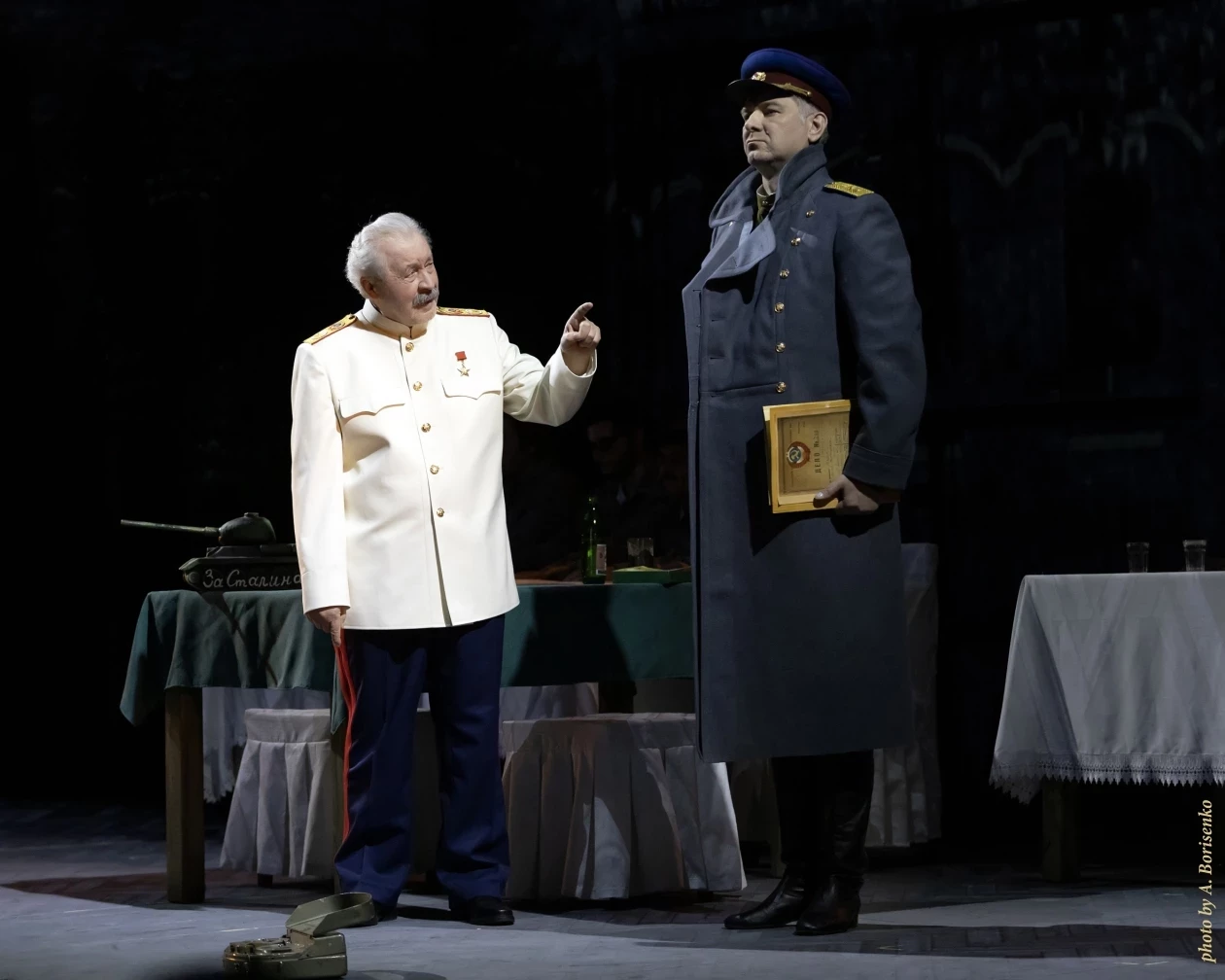 Сцена из спектакля. Сталин (Александр Запорожец) и Абакумов (Борис Белезебьев). Фото: Александр Борисенко, предоставлено Приморским академическим краевым драматическим театром имени М. Горького
