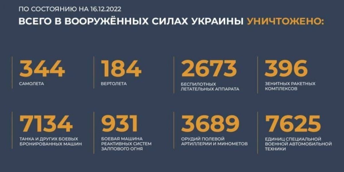 Отметим, с утра 16 декабря 2022 года на всей территории Украины была объявлена воздушная тревога. Минобороны России сообщает, что ракетными ударами в Херсонской области в районе города Берислав «поражены пункты управления подразделений 1-й бригады территориальной обороны», в Харькове уничтожен склад ВСУ с ракетно-артиллерийским вооружением.
