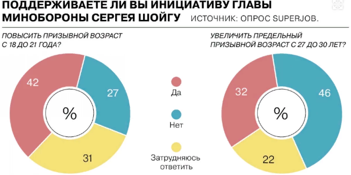 Кстати, возраст призыва в армию Шойгу предложил постепенно поднять с 18 до 21 года (молодежь стала позже взрослеть, в восемнадцать парни — часто еще совсем юнцы, а не воины), а предельный возраст увеличить с 27 до 30 лет.