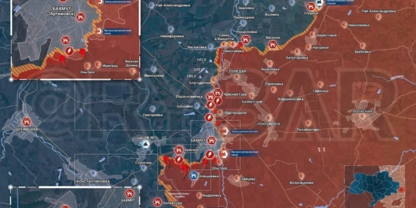 На западе от Бахмута «вагнеровцы» вплотную подошли к трассе от Часов Яра — сейчас она находится под огневым контролем. Кроме того, бойцы ЧВК «Вагнер» прорвали рубежи обороны ВСУ на юго-западной окраине Красного, а также уверенно продвигаются со стороны Клещеевки на север, фактически начав бои за юго-западный пригород Бахмута.