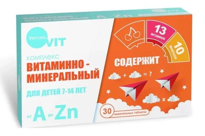 Витаминно-минеральный комплекс от а до цинка под названием Verrum-vit предназначен для детей в возрасте от 7 до 14 лет. Этот препарат идеально подходит для нормализации роста и развития организма, а также укрепления иммунитета малыша. Веррум-вит также улучшает физическое и эмоциональное состояние, помогает повысить интеллектуальные возможности и концентрацию внимания ребенка. Каждая таблетка содержит необходимые активные вещества, включая витамины A, В1, В2, В6, В12, С, Д3, Е, Н, а также цинк. Они являются неотъемлемыми элементами для нормального функционирования организма. Применение комплекса Verrum-vit очень простое. Ребенку нужно принимать по 1 таблетке в день во время еды. Рекомендуется разжевывать таблетку, чтобы обеспечить лучшее усвоение полезных веществ организмом. Не забывайте, что правильное питание важно для детского здоровья, но иногда организму не хватает необходимых витаминов и минералов, поэтому Verrum-vit – это отличный способ дополнить детскую диету необходимыми элементами и обеспечить полноценное развитие и рост ребенка.Период приема продлится 30 дней.