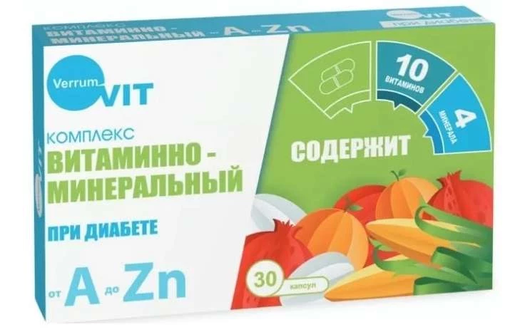 Недорогие витамины Verrum Vit рекомендуется использовать как источник витаминов (А, Е, В1, В2, В3, В5, В6, В9, В12, С), липоевой кислоты, макро- и микроэлементов (магния, цинка, хрома, селена), рутина и флавонгликозидов. Это биологически активное средство помогает поддерживать здоровье и укреплять иммунную систему. Добавка является полезным дополнением к питанию для поддержания баланса в организме. Это лучшие дешевые витамины для диабетиков.