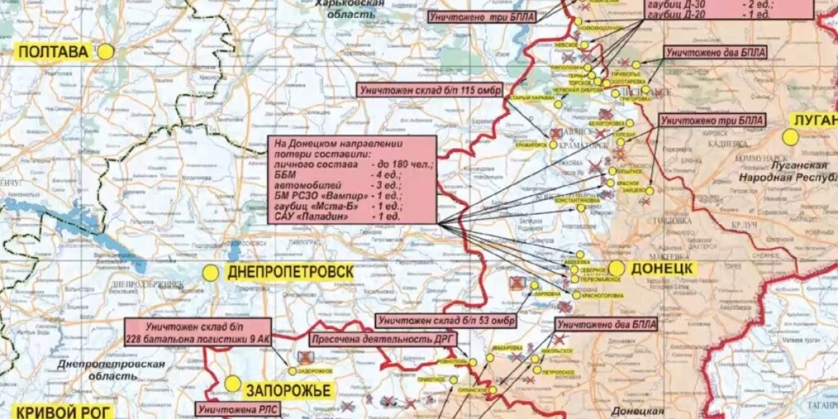 За сутки уничтожено до 180-ти украинских военнослужащих и иностранных наемников, четыре боевые бронированные машины, три автомобиля, боевая машина реактивной системы залпового огня RM-70 «Vampire» чешского производства, гаубица «Мста-Б», а также самоходная артиллерийская установка М109 «Paladin» производства США.