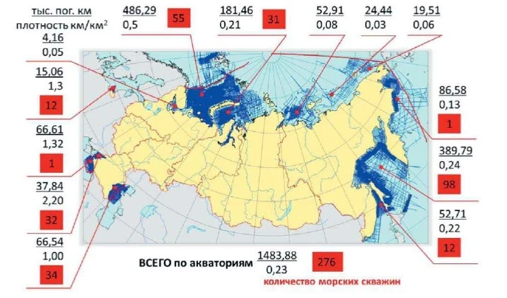 Преобладающая часть морских углеводородов залегает в Баренцевом и Карском морях (западный арктический шельф) и в Охотском море (Дальневосточный шельф). Бурение разведочных скважин проведено всего на 11 прогнозных залежах, в результате подтверждены только 6% начальных суммарных запасов шельфовой нефти и 11% начальных суммарных запасов газа.
