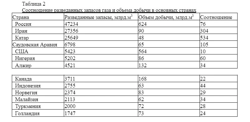 Другое положение складывается с природным газом. Как видно из таблицы 2, Россия обладает в этой сфере стратегическими преимуществами: более чем 25% мировых запасов и таким же удельным весом производства. Традиционно основным потребителем его является Европа, куда поступает более 90% российского экспорта.