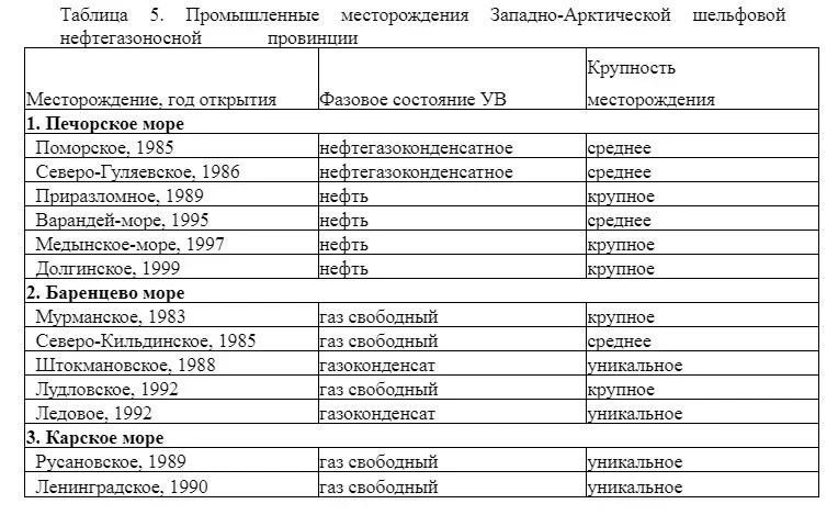 В результате цикла работ в Баренцевом и Карском морях, выполненных в 1970-80-х гг., была открыта и подготовлена к освоению Западно-Арктическая шельфовая нефтегазоносная провинция (включающая нефтегазоносные и перспективные структуры Баренцева, Печорского и Карского морей), недра которой содержат до 80% ресурсов арктического шельфа России. В пределах провинции было выявлено и разведано более 10 промышленных нефтяных, нефте-, газоконденсатных и газовых месторождений, включая 4 уникальных (Штокмановское и Ледовое в Баренцевом море, Ленинградское и Русановское — в Карском) и 4 крупных. На Западно-Арктическом шельфе России открыты не только акваториальные продолжения бассейнов суши (Тимано-Печорская и Западно-Сибирская НГП), но и самостоятельные, возможно, более богатые шельфовые нефтегазоносные бассейны (Баренцевская НГП) (табл.5).
