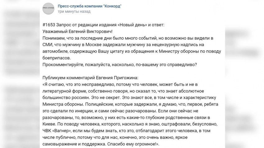 Совместно с ЧВК «Вагнер» Пригожин готов публично отблагодарить мужчину, которого задержали и оштрафовали, потому что для бойцов важна такая поддержка и «яркое самовыражение».