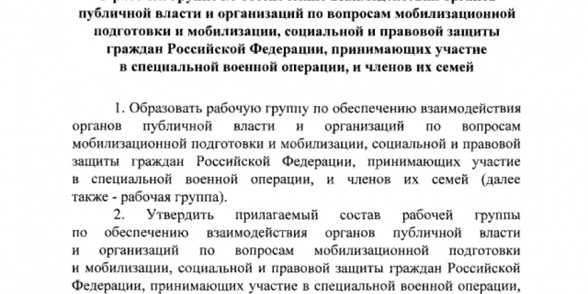 Путин распорядился создать рабочую группу по взаимодействию власти по вопросам мобилизации