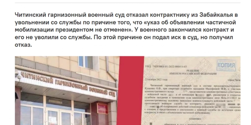 Напомним, что, когда у военнослужащего закончился контракт, его почему-то не уволили со службы. По этой причине он подал иск в суд, но там тоже получил отказ. В решении указывается, что юридически мобилизация не завершена, а значит, продолжается: