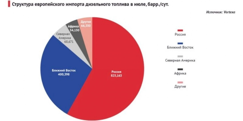 Тем временем, Европа увеличила закупки российского дизтоплива на четверть: его импорт с 1 по 19 июля текущего года достиг 825 тысяч баррелей в сутки, что на 24% выше уровня июня. Согласно данным Vortexa, российское дизтопливо в июле составляет почти 60% европейского импорта. Ожидается, что в целом европейский импорт дизтоплива в июле составит 1,41 млн баррелей в сутки.