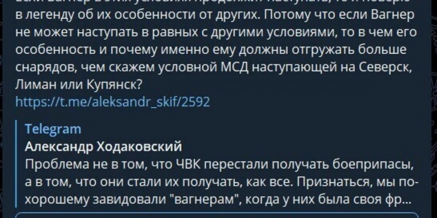 Телеграм-каналы предполагают, что «Вагнеру» не перекрыли поставку боеприпасов совсем, а лишь урезали до нормы: