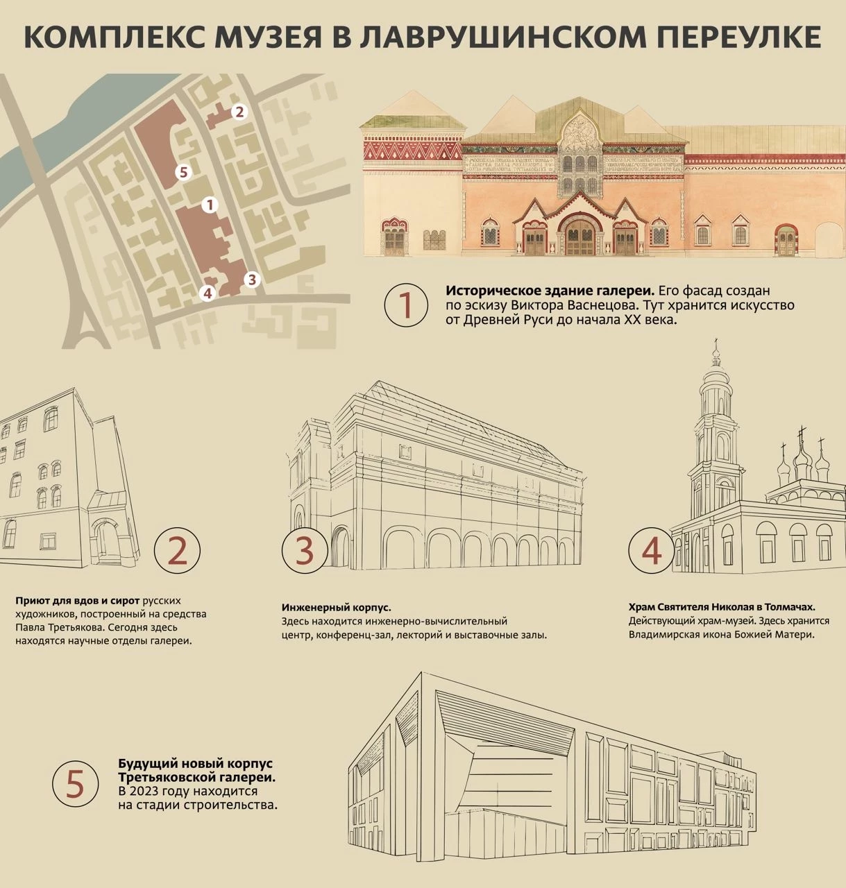 Основой музея остается комплекс зданий в Лаврушинском переулке в Москве. Тут хранится сердце коллекции: от древних икон, включая Владимирскую Богоматерь в музейном храме — до самых известных работ, которые тщательно собирал сам Павел Третьяков, а также произведений начала ХХ века.