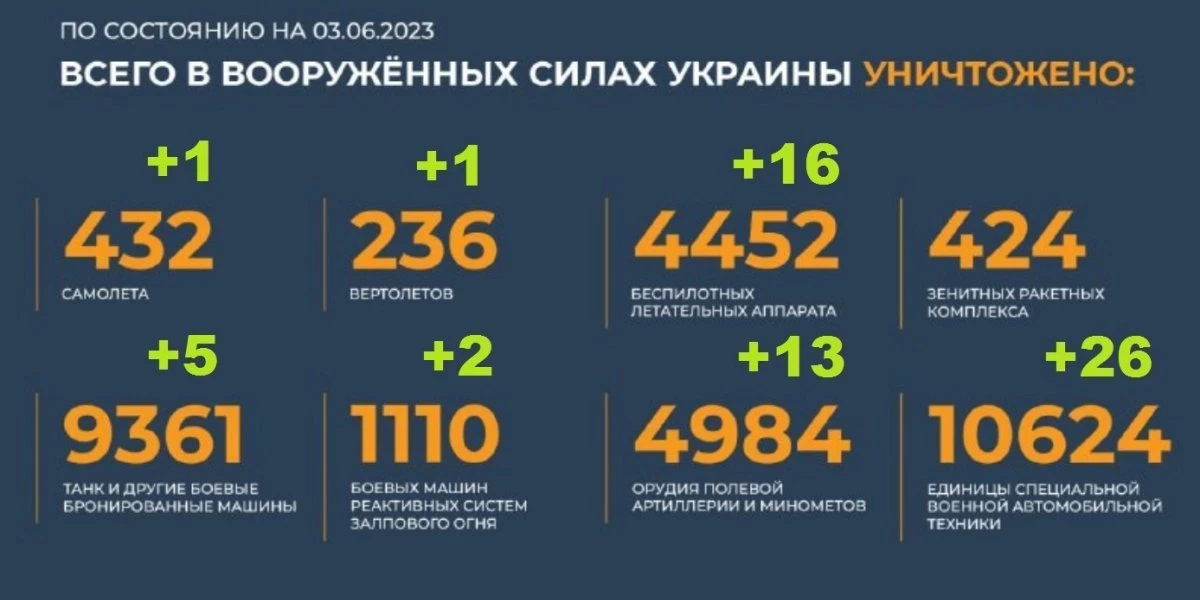 Ранее сообщалось, что украинские силы утром в понедельник 5 июня развернули крупномасштабное наступление на пяти участках фронта. Минобороны России позже сообщило, что наступательные действия ВСУ успеха не имели, противник потерял 250 человек, 16 танков, три БМП и 21 боевую бронированную машину. Источник
