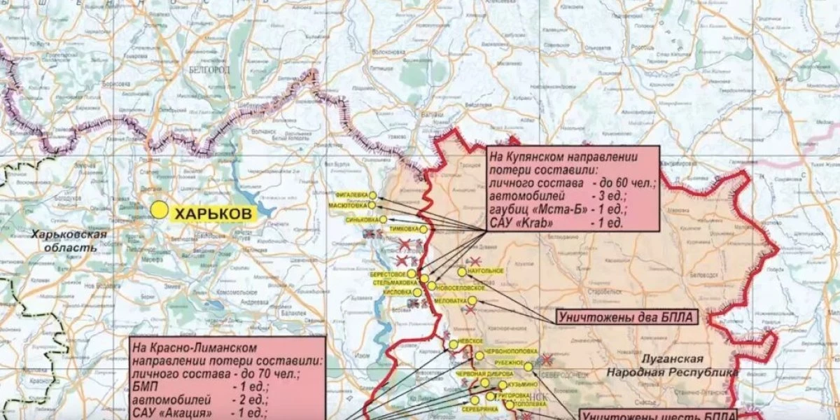 На Купянском направлении оперативно-тактической и армейской авиацией, артиллерией «Западной» группировки войск поражена живая сила и техника ВСУ в районах населенных пунктов Фигалевка, Масютовка, Кисловка, Тимковка Харьковской области и Стельмаховка Луганской народной республики.