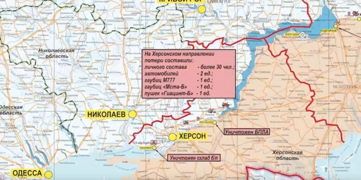 На Херсонском направлении в результате огневого поражения потери ВСУ составили более 30-ти военнослужащих, два автомобиля, артиллерийская система М777 производства США, гаубица «Мста-Б», а также орудие «Гиацинт-Б».