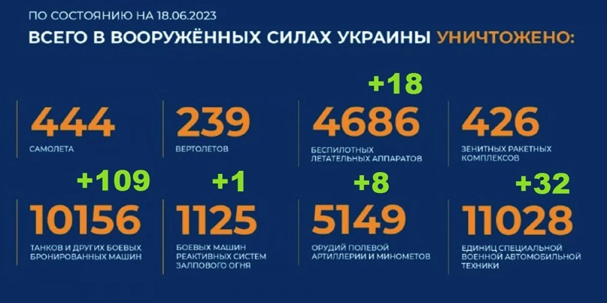 Потери Украины на сегодня 18.06.2023 Всего с начала проведения специальной военной операции уничтожено: 444 самолета, 239 вертолетов, 4686 беспилотных летательных аппаратов, 426 зенитных ракетных комплексов, 10156 танков и других боевых бронированных машин, 1125 боевых машин реактивных систем залпового огня, 5149 орудий полевой артиллерии и минометов, а также 11028 единиц специальной военной автомобильной техники.