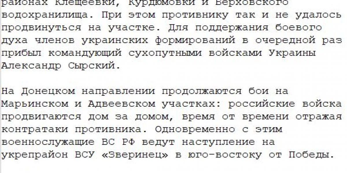 Донецкое направление: на Авдеевском участке бойцы российской армии атаковали у Степного, а также наступают при поддержке авиации на юго-западных подступах к Авдеевке. К тому же ВС РФ контратаковали со стороны Водяного. В Марьинке продолжаются ожесточенные бои, а в Новомихайловке российские военные предприняли попытку штурма;
