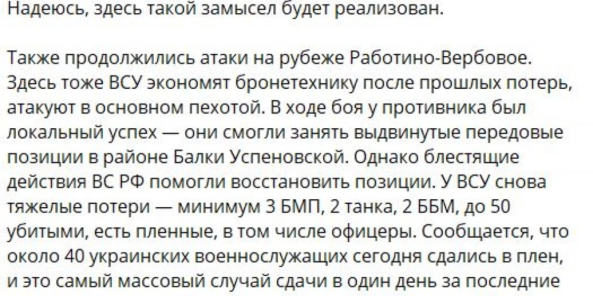Также канал опубликовал информацию о вероятном восстановлении контроля над ранее оставленным селом Пятихатки. Днем 18 июня ряд источников сообщил, что под напором пехоты ВСУ российские войска отошли на второй рубеж обороны, после чего по украинским формированиям были нанесены массированные авиационные и артиллерийские удары.