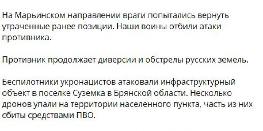 В свою очередь, группировка войск «Восток» ВС РФ сорвала несколько попыток наступления батальонных групп ВСУ под Новопокровкой, Новоданиловкой и Малой Токмачкой. Также российские войска ударом по колонне противника вывели из строя 9 танков и до 20 других бронемашин.